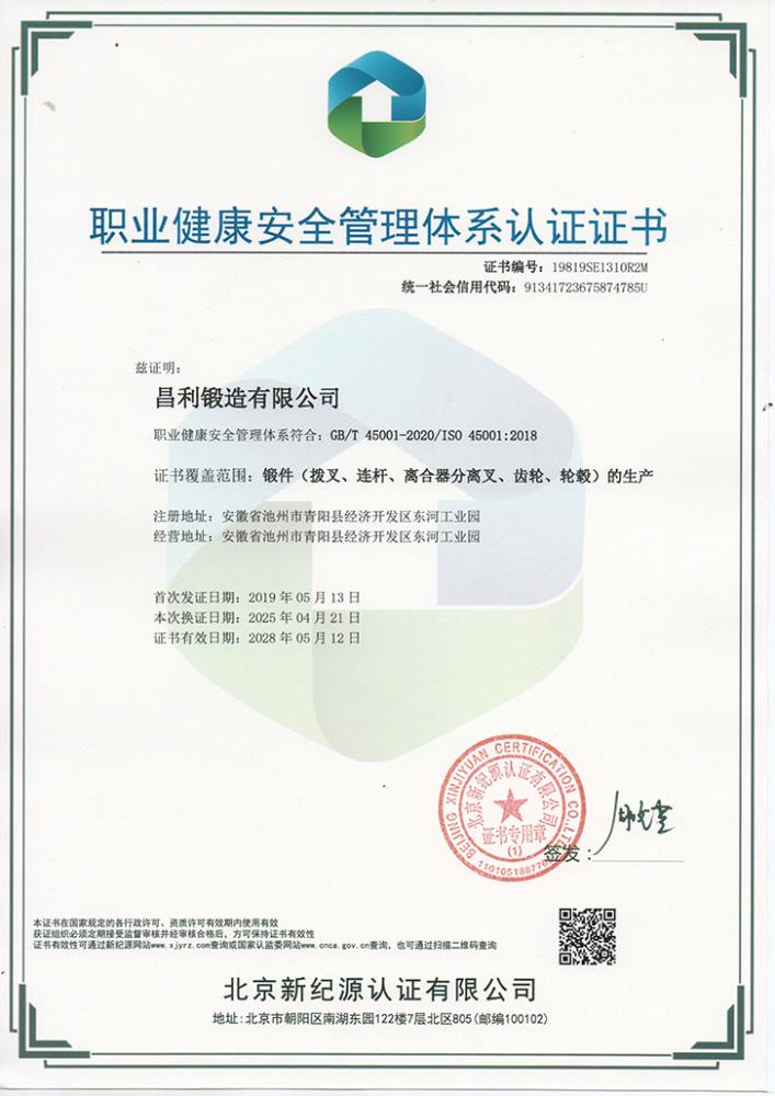 职业健康安全管理体系认证证书(中)